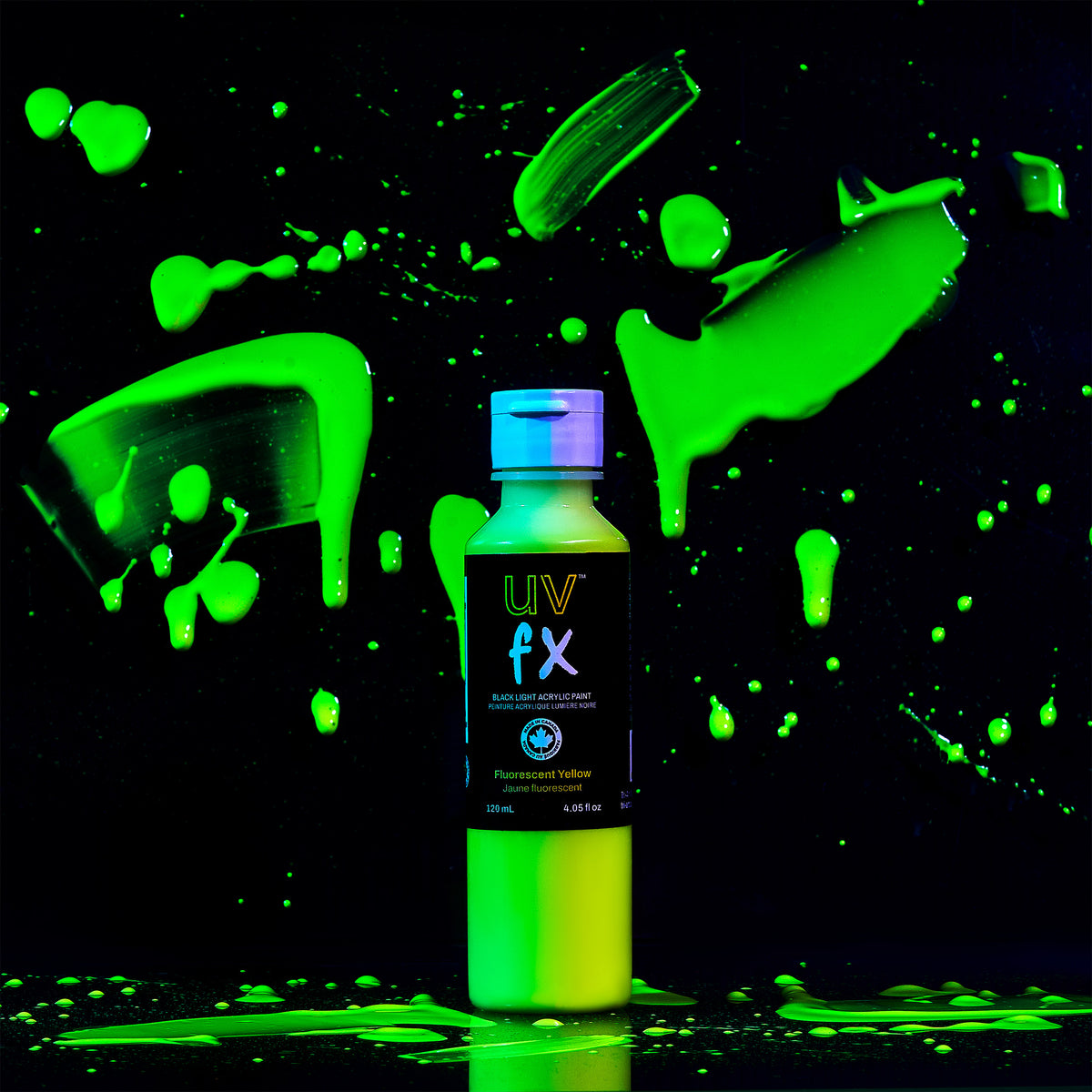 Tri-Art UVFX is a selection of acrylic black light paints built for bold fluorescent impact under UV light. Choose from fluorescent colours, plus black, glow, and UVFX gloss or matte mediums.