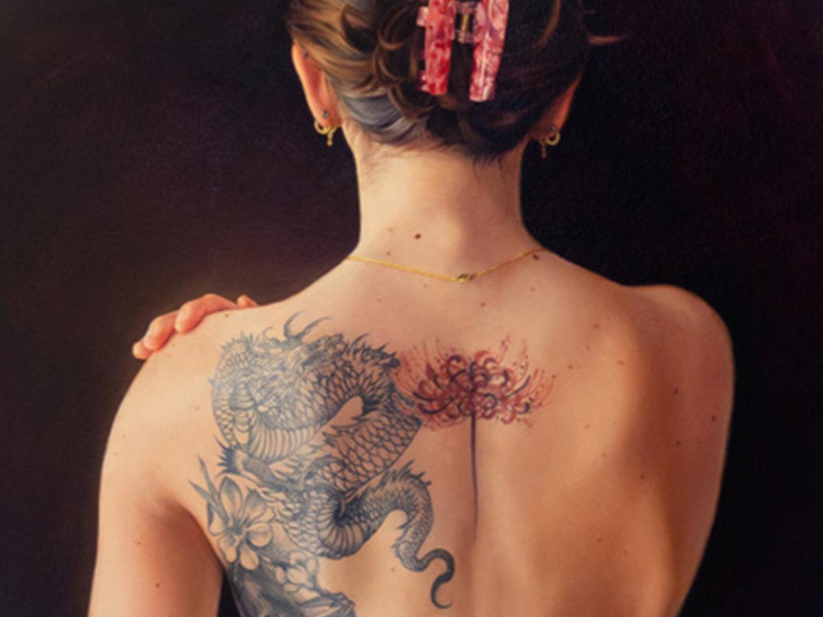 I like to work larger – you can get into it more. Larger works also consume your field of view. However, I’m often restricted by an easily transportable size. For some works I have consciously thought about shape and scale. In Curves I wanted it to be the size and shape of a bathroom mirror. My friend sent me a picture of her new tattoo taken in bathroom mirror. She has scoliosis and has had to have it corrected her whole life; she’s never felt happy with her back. To change that she’s embellished her back with these tattoos. I wanted the scale of the painting to capture a true to life moment, my friend looking at her new tattoos in her mirror.
