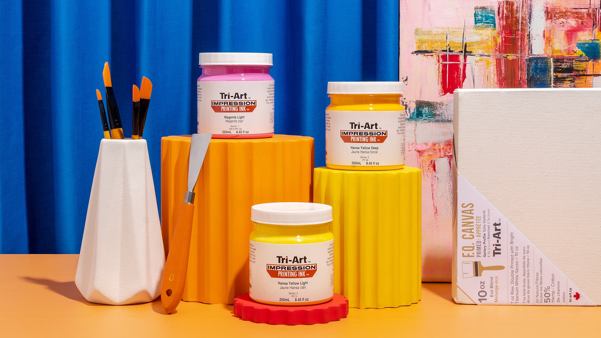 Yes, Tri-Art’s lino-block demos show printing beyond paper, including cardboard, fabric, and wood using the same basic method (thin, even ink film, proof print, then press evenly); for fabric prints, they specifically recommend washing in cool water, and for mixed-media builds where you want to collaged layers over a print, pair your dried print with acrylic gel or polymer medium from Tri-Art Acrylic Mediums rather than relying on household glues.